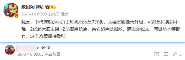 除影像外,小米18工程机还被曝配备“7开头”的电池,预计容量在7000mAh以上,较前代有明显增长。在机身尺寸受限的情况下实现大电池,对内部堆叠和散热设计是不小的考验。同时,爆料称新机将支持超声波指纹识别、满血无线充电以及顶级的防尘防水等级。
